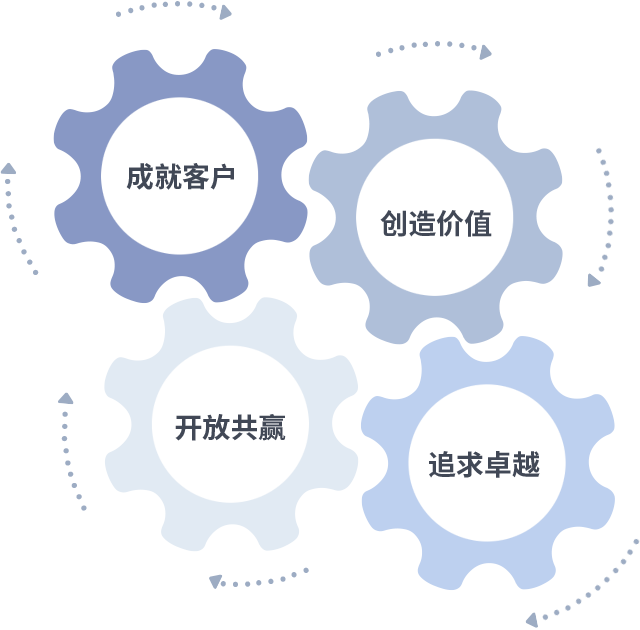 成就客户是一切决策的出发点,,,,创造价值是衡量所有工作的标准,,,追求卓越是我们做事做人的态度,,开放共赢是我们的格局也是最终的结果。。。。价值观的齿轮环环相扣,,,推动着组织里的每个人不断向前。。。